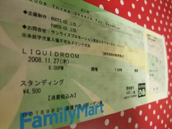 ①今月末にあるAIRのライブ@恵比寿LIQUID ROOM のチケット。